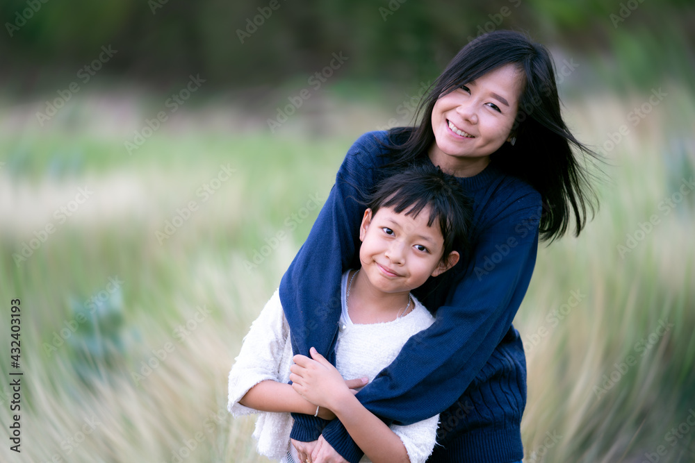 Happy mother and daughter smiling in a beautiful meadow field.Concept of mothers day