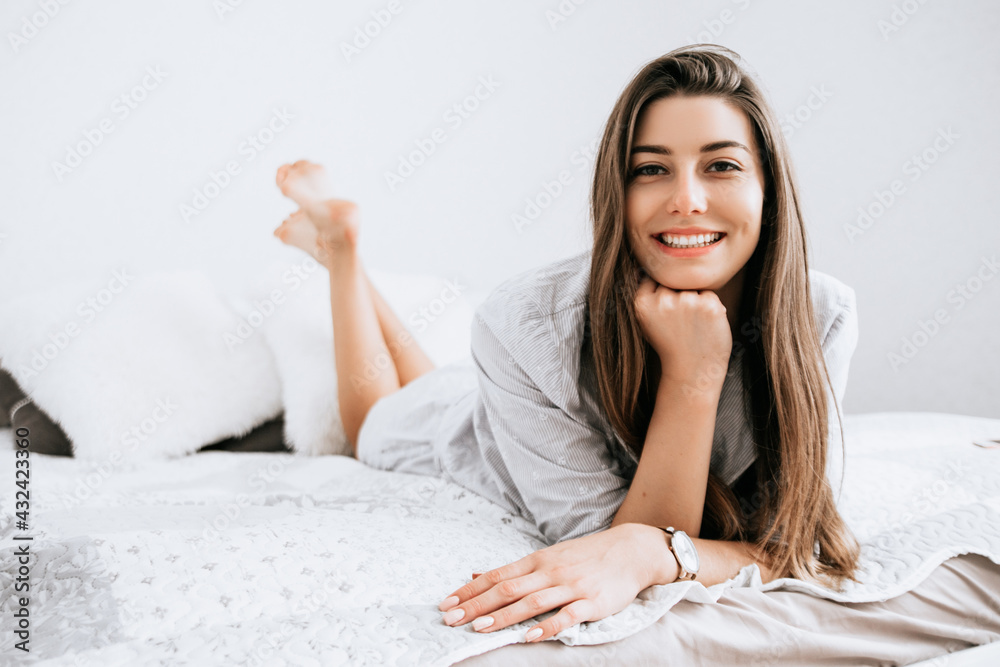 Young smiling woman lying in bed in her bedroom. Happy morning.