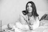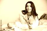 Young smiling woman lying with pillow in bed in her bedroom. Happy morning.