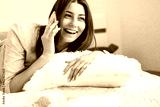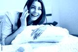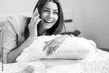 Young smiling woman lying in white bed and using a phone in her bedroom. Happy morning.