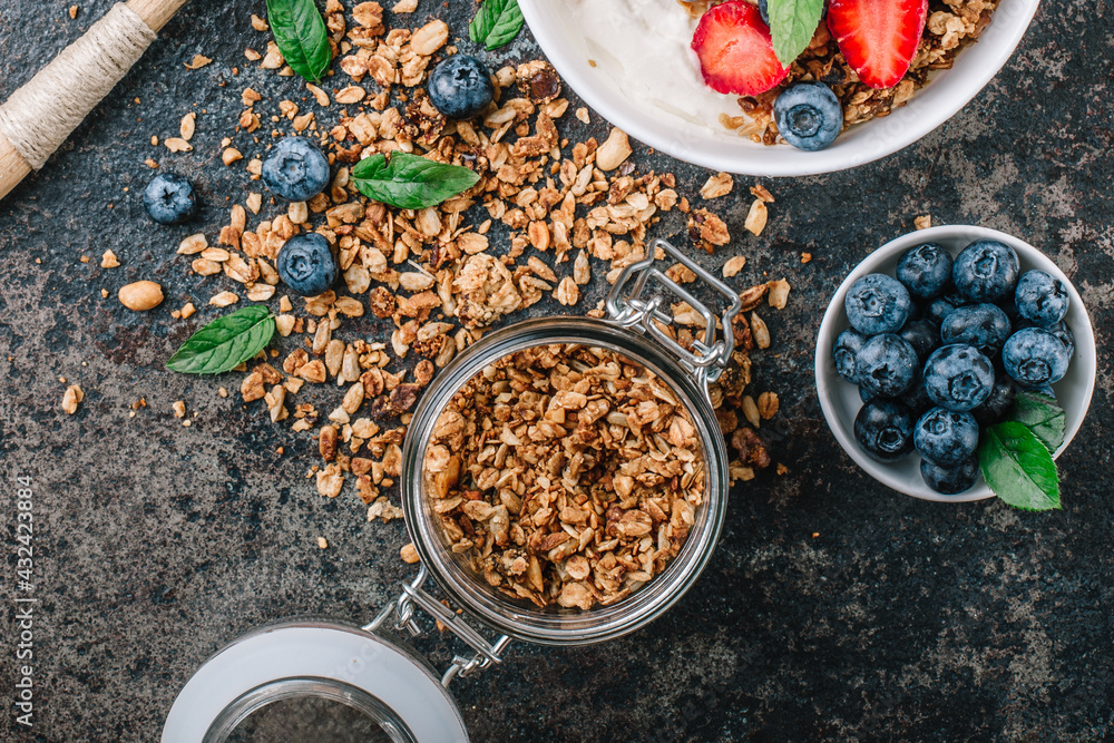 Healthy breakfast with granola, yogurt, fruits, berries on dark metal background. Summer homemade breakfast.