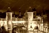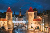 Tallinn, Estonia. Famous Landmark Viru Gate In Street Lighting At Evening Or Night Illumination. Towers In Christmas Holidays Decorations