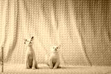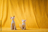 Two Funny Small Little White Devon Rex Kittens Kitty Cats On Yellow Plaid Background. Short-haired Cat Of English Breed. Shorthair Pet Cat