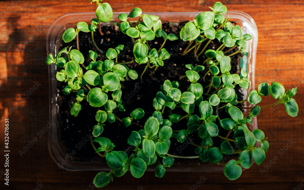 Top view of green seedlings grown in soil in plastic reused tray container on wooden windowsill. Gardening at home.