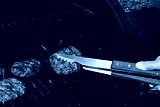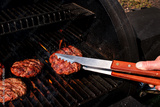 Roasted meat BBQ burger patty for hamburger in metallic tongs utensils over flaming grill barbecue with smoke. Outdoor summertime meal.