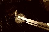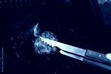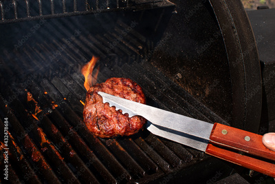 Roasted meat BBQ burger patty for hamburger in metallic tongs utensils over flaming grill barbecue with smoke. Outdoor summertime meal.
