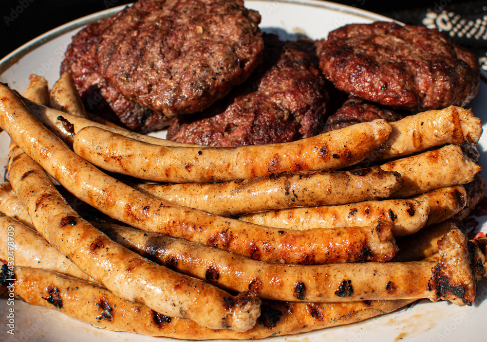 Roasted bbq sausages with grillmarks and grilled homemade meat BBQ burgers for hamburger on plate. Outdoor summertime meal.