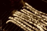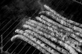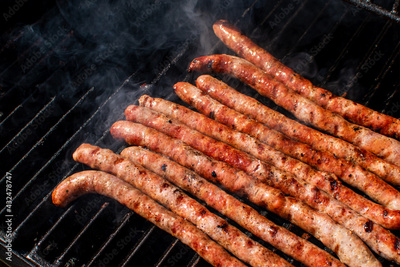 Roasted bbq sausages with grillmarks cooking on grill barbecue with smoke. Outdoor summertime meal preparing. High angel view.
