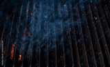 Empty flaming BBQ charcoal grill with smoke or barbeque with black iron grate for cooking outdoor meal.