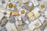Top view different wrapped gift boxes on white marble multicolored various presents giving package