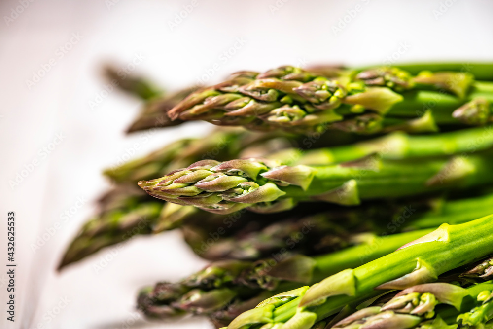 green asparagus on wooden table