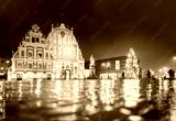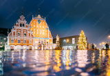 Riga, Latvia. Town Hall Square, Popular Place With Famous Landmarks On It In Night Illumination In Winter Twilight. Winter New Year Christmas Holiday Season