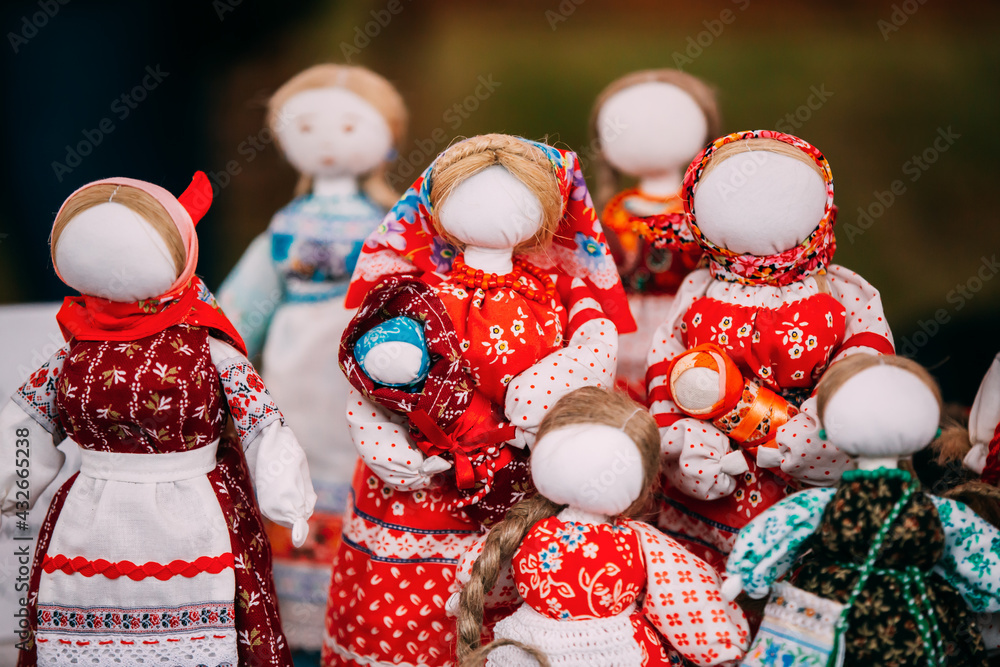 Russian Folk Doll. National Traditional Folk Dolls Are Popular Souvenirs From Russia