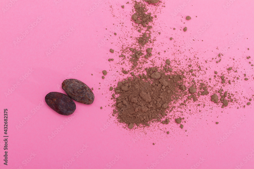 Cocoa beans and brown cocoa powder on a pink background, copy space