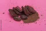 Cocoa beans and brown cocoa powder and chocolate pieces on a pink background, copy space