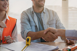 Close up hand of group,team young contractor, engineer handshake with partnership, customer after agreement to work together at the site, workplace.Business success concept.