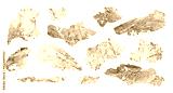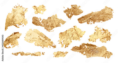 Gold glitter and bronze color blot. Abstract torn piece of metal leaf (potal) paper on white background.