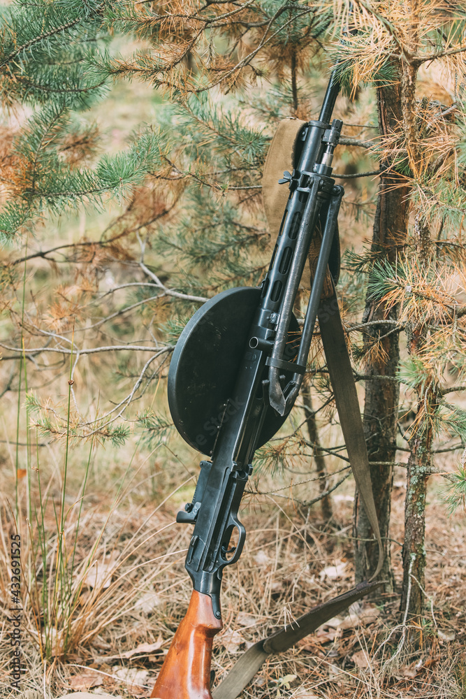 Old Soviet Russian DP Machine Gun Of World War II Leaning Against Trunk Of Tree. Weapon Of Red Army