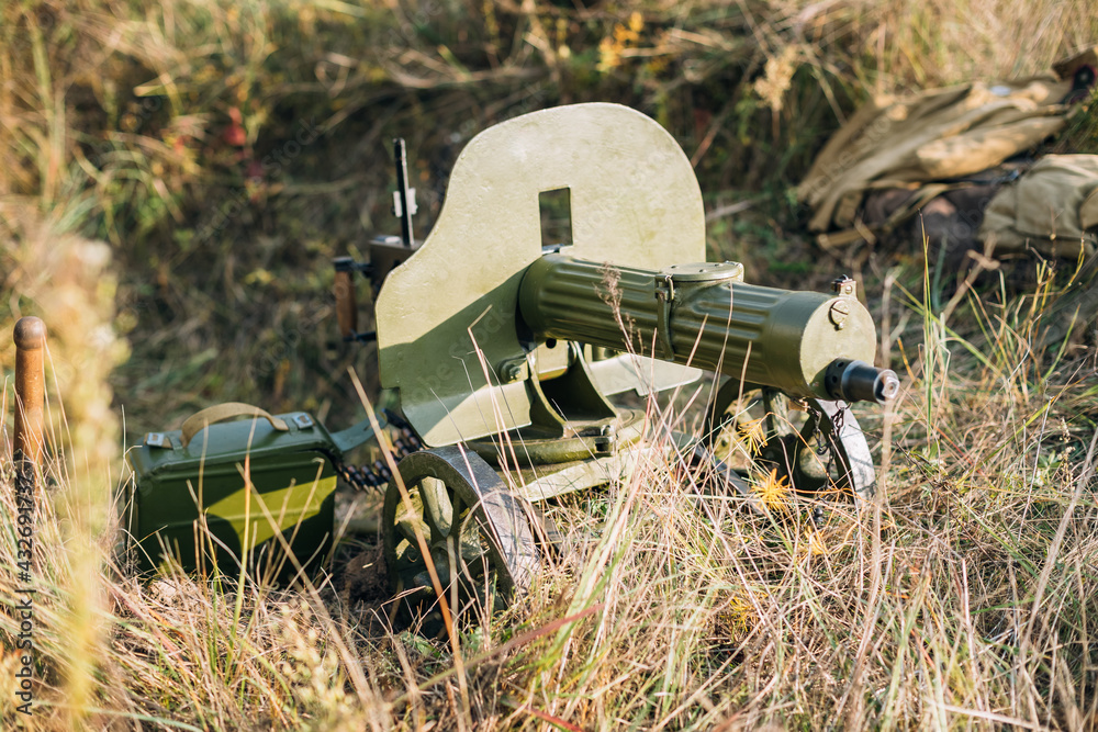 Maxim's Machine Gun Model 1910/30 On A Wheeled Vladimirov's Mount In Grass