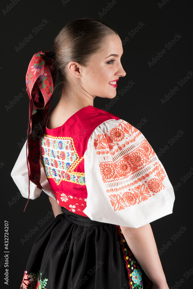 Young beautiful slovak woman in traditional dress. Slovak folklore