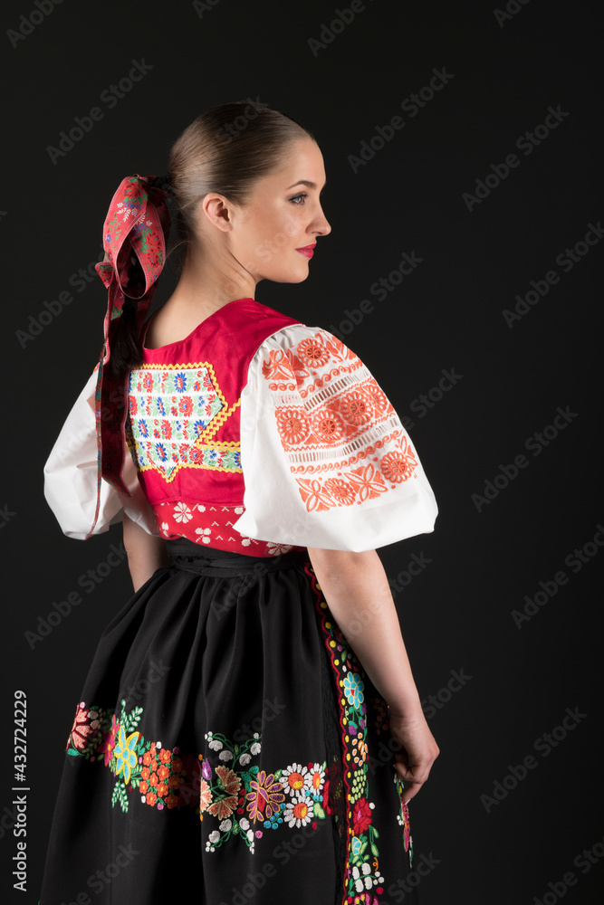 Young beautiful slovak woman in traditional dress. Slovak folklore