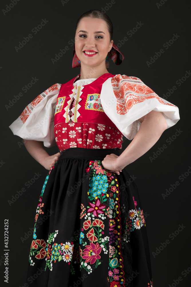 Young beautiful slovak woman in traditional dress. Slovak folklore