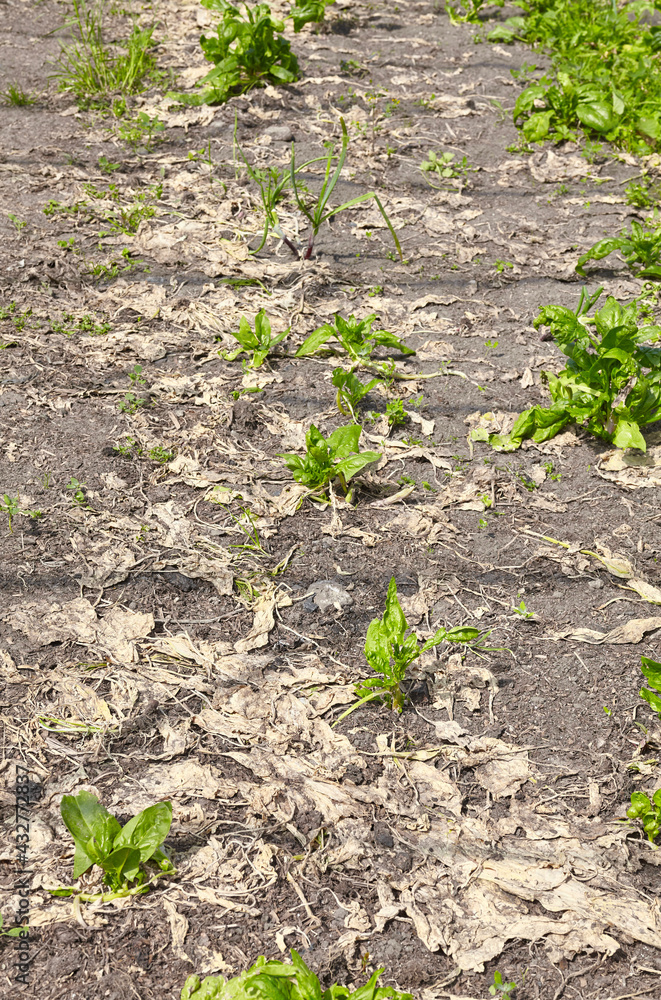 Last survived plants on an organic vegetable farm during drought, selective focus.