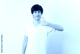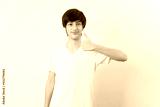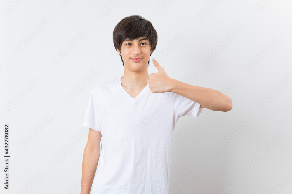 Smiling Caucasian boy portrait isolated on white background. Beautiful teen male model with thumb up finger posing.