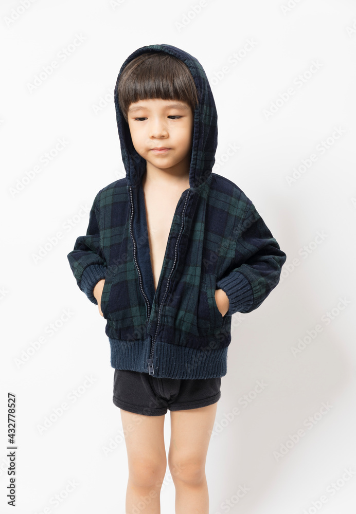 Asian Little Boy Wearing a Hoodie isolated White Background.