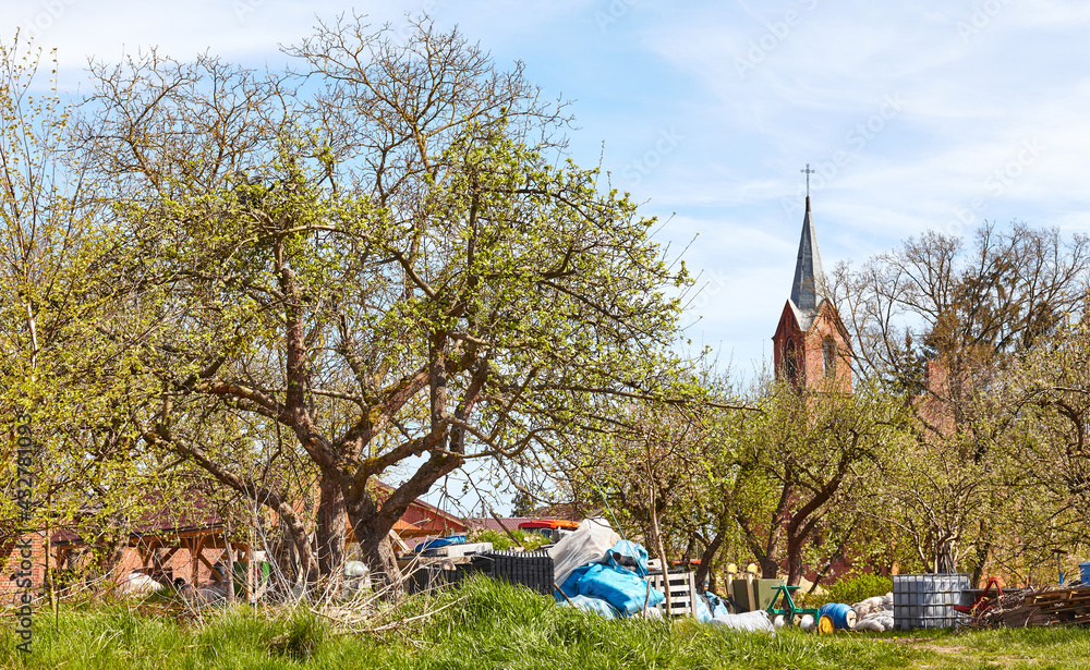 Rural landscape in the spring with with church tower in distance.