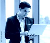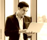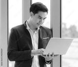 A portrait of a relaxed young businessman in a casual suit standing, holding a laptop and looking to screen smiling happily. Business success concept..