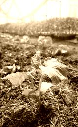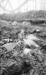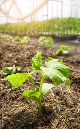Close up picture of cucumber seedlings in a greenhouse, selective focus.