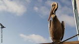Wild brown pelican on wooden pier railing, Oceanside boardwalk, California ocean beach, USA wildlife. Gray pelecanus by sea water. Big bird in freedom close up and blue sky. Large bill beak. Low angle
