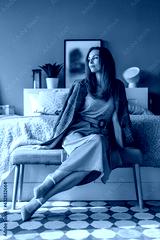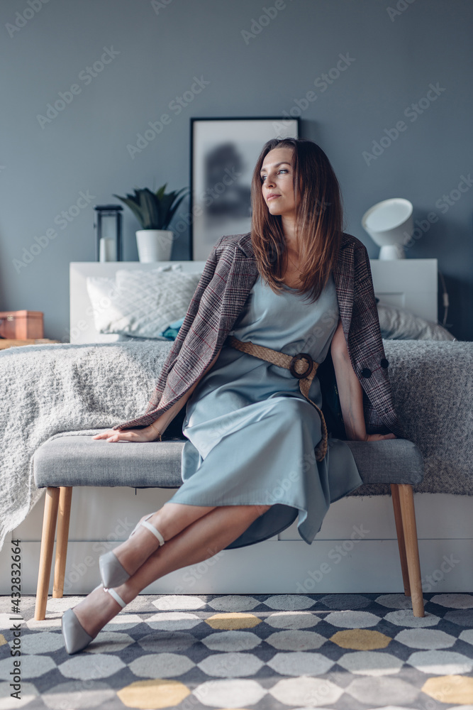Woman at home in bedroom sitting on bedside bench.