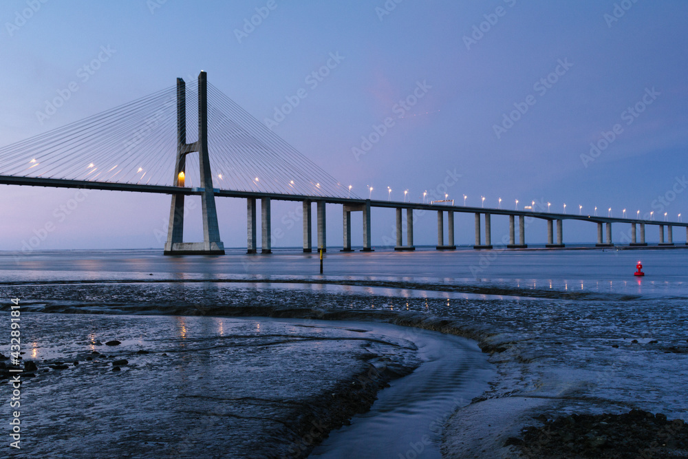 Amazing view of Vasco da Gama Bridge at sunset. The Vasco da Gama Bridge crosses the Tagus River and is one of the longest bridges in the world. Lisbon. Portugal.