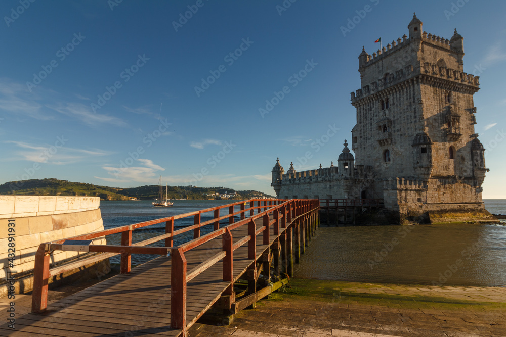 Belem Tower is a fortified tower on the Tagus river at sunset. Lisbon. Portugal. UNESCO World Heritage Site. Top tourist attraction in Europe. Concept of travel and tourism.