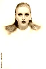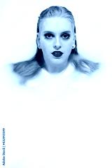 Attractive young woman with blue eyes and red lips is lying in spa bath with milk and looking at camera. Vertically.