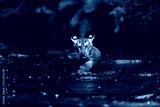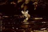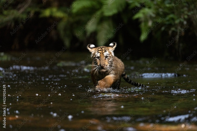 Cute Bengal tiger cub is running in the river against the camera. Horizontally.