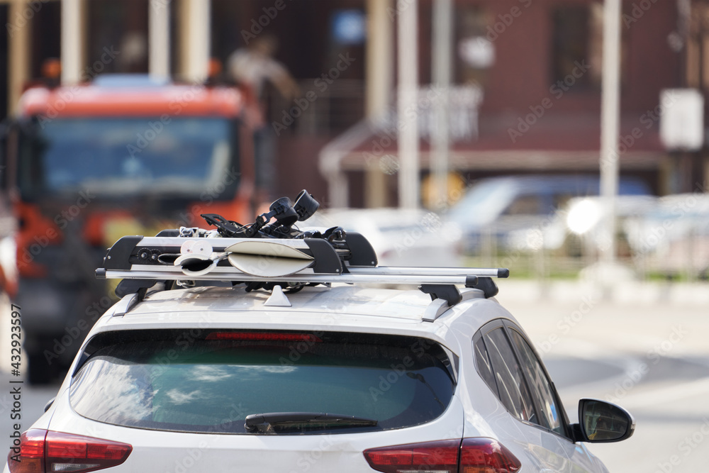 A trip to a ski resort. A fragment of the roof of a car with fixed snowboards. Selective focus.