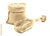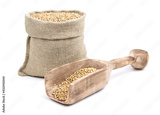 Seeds of coriander in a sack of isolated on a white background. Coriander in a burlap sack. Healthy food. Coriander in a jute bag. Vegan food