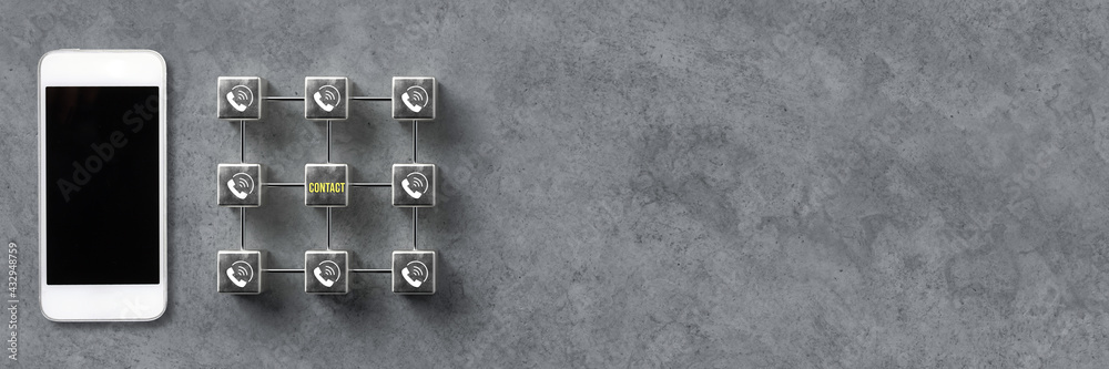 cube grid with message CONTACT and telephone icons with smartphone on concrete background