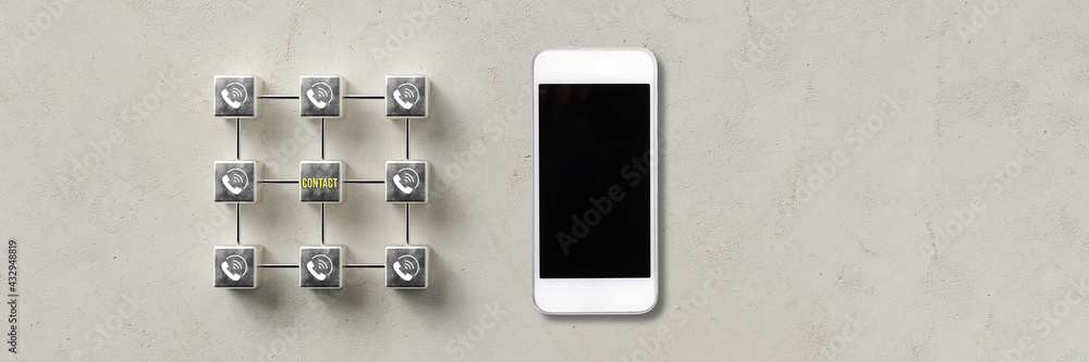 cube grid with message CONTACT and telephone icons with smartphone on concrete background