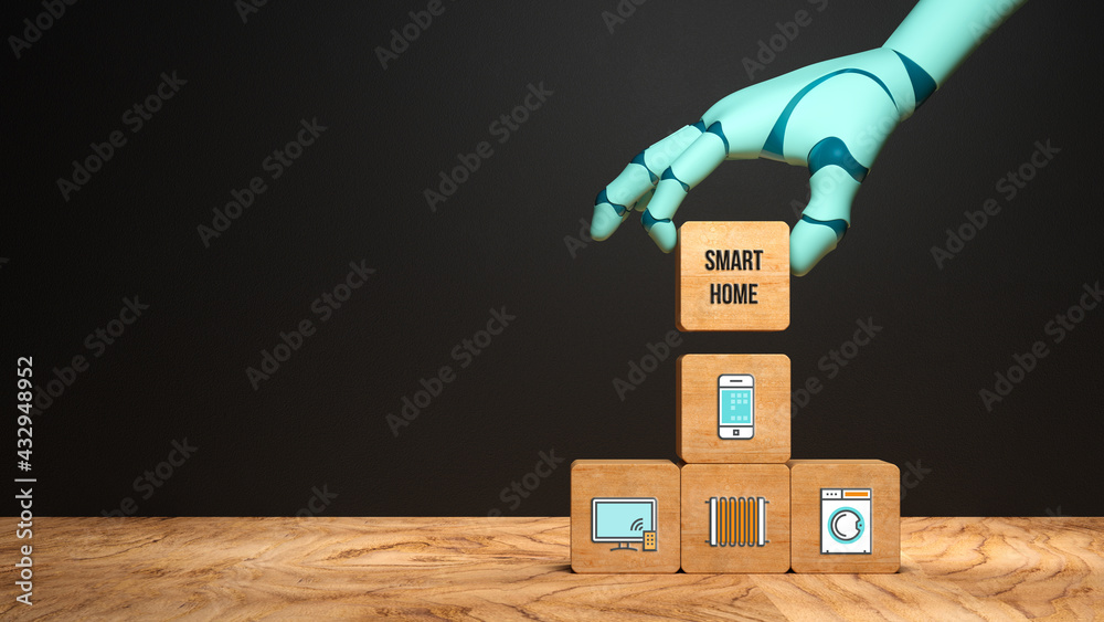 robot hand adding a cube with message SMART HOME to a stack of others with home appliances symbols in front of a blackboard