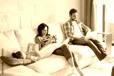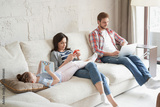 Father, mother and daughter using electronic devices sitting on sofa at living room.