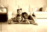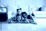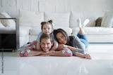 Young caucasian family with small daughter pose relax on floor in living room, smiling little girl kid hug embrace parents, show love and gratitude, rest at home together.