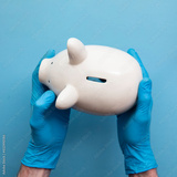 Doctor wearing blue gloves holding a piggy bank. Health care finance concept