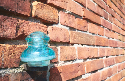 Close up picture of an old glass electrical insulator on a brick wall, selective focus.