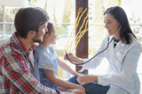 Little girl at the doctor for a checkup. Doctor woman auscultate the heartbeat of the child.