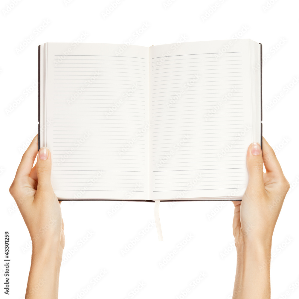 woman hand carrying an empty book isolated on white background