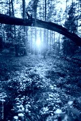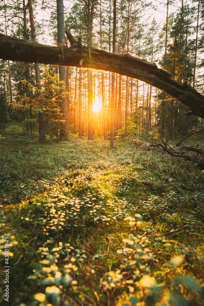 Sunset in autumn forest. Fallen Old Pine Tree In Coniferous Forest After Strong Hurricane Wind. European Green Coniferous Forest